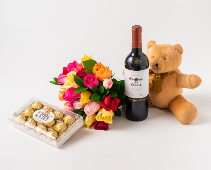Buquê de 24 Rosas Coloridas, Chocolate, Pelúcia e Tinto