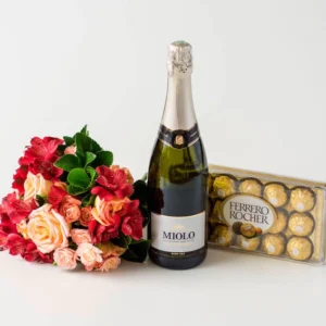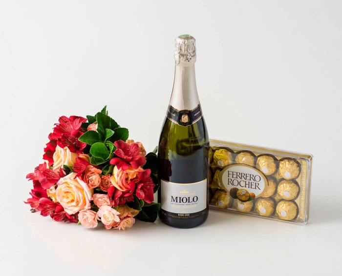 Buquê de Rosas e Astromélias em Tons Rosados, Chocolate