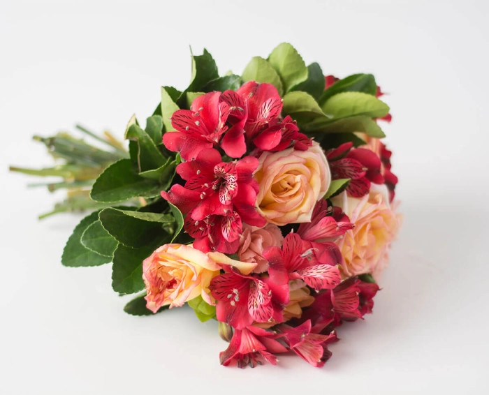 Em cores suaves, rosas e astromélias trazem o significado de amizade e felicidade plena. Nesse buquê, acompanhado por bombons e champanhe, se tornam opções ideais para presentear a pessoa amada.