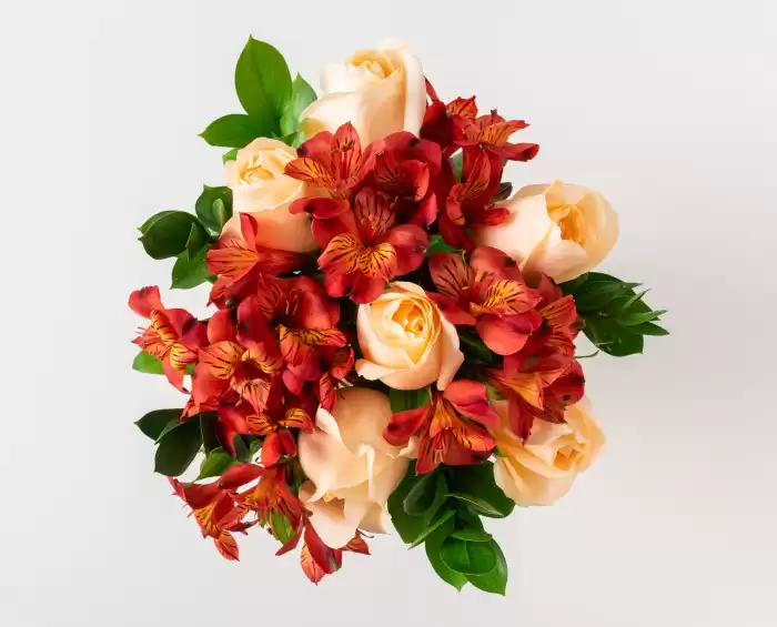 Presenteie com este buquê para simbolizar seu amor e seu carinho por alguém especial. Ele é confeccionado com rosas nacionais e astromélias de talo médio e em cores suaves, envolvidas especialmente por Ruscus e com acabamento em ráfia.